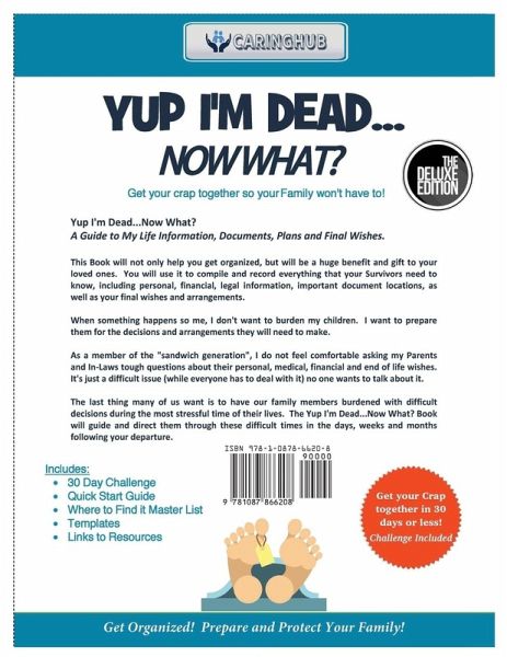 Yup I'm Dead...Now What? The Deluxe Edition A Guide to My Life Information, Documents, Plans and Final Wishes. Get your crap together so your Family won't have to! THE PERFECT GIFT (to give or to get)!! Take the Challenge: Get your crap together in 30 days or less! This book will not only help you get organized, but will be a huge benefit and gift to your loved ones. You will use it to compile and record everything that your survivors need to know, including personal, financial and legal information, important document locations, as well as your final wishes and arrangements. When something happens to me, I don't want to burden my children. I want to alleviate stress, not add to it! When the time comes for your "departure", your family may be confused about what to do and who to call. You can give your loved ones peace of mind knowing that (when the time comes) they will have this Book that will guide them through the difficult days, weeks and months following your Departure. Prepare and Protect Your Family!!