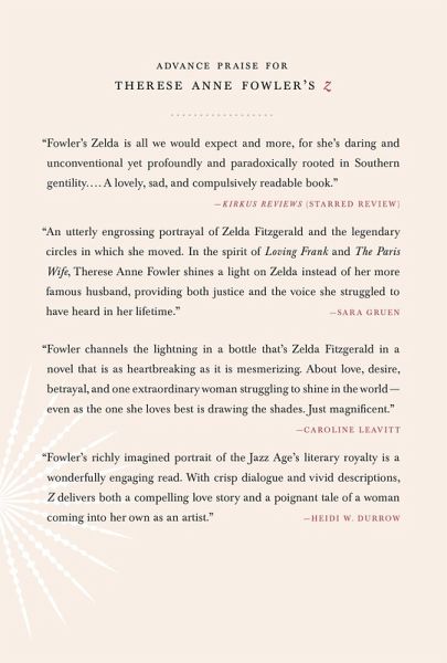 THE INSPIRATION FOR THE TELEVISION DRAMA Z: THE BEGINNING OF EVERYTHING With brilliant insight and imagination, Therese Anne Fowler's New York Times bestseller Z brings us Zelda's irresistible story as she herself might have told it. I wish I could tell everyone who thinks we're ruined, Look closer...and you'll see something extraordinary, mystifying, something real and true. We have never been what we seemed. When beautiful, reckless Southern belle Zelda Sayre meets F. Scott Fitzgerald at a country club dance in 1918, she is seventeen years old and he is a young army lieutenant stationed in Alabama. Before long, the "ungettable" Zelda has fallen for him despite his unsuitability: Scott isn't wealthy or prominent or even a Southerner, and keeps insisting, absurdly, that his writing will bring him both fortune and fame. Her father is deeply unimpressed. But after Scott sells his first novel, This Side of Paradise, to Scribner's, Zelda optimistically boards a train north, to marry him in the vestry of St. Patrick's Cathedral and take the rest as it comes. What comes, here at the dawn of the Jazz Age, is unimagined attention and success and celebrity that will make Scott and Zelda legends in their own time. Everyone wants to meet the dashing young author of the scandalous novel-and his witty, perhaps even more scandalous wife. Zelda bobs her hair, adopts daring new fashions, and revels in this wild new world. Each place they go becomes a playground: New York City, Long Island, Hollywood, Paris, and the French Riviera-where they join the endless party of the glamorous, sometimes doomed Lost Generation that includes Ernest Hemingway, Sara and Gerald Murphy, and Gertrude Stein. Everything seems new and possible. Troubles, at first, seem to fade like morning mist. But not even Jay Gatsby's parties go on forever. Who is Zelda, other than the wife of a famous-sometimes infamous-husband? How can she forge her own identity while fighting her demons and Scott's, too?