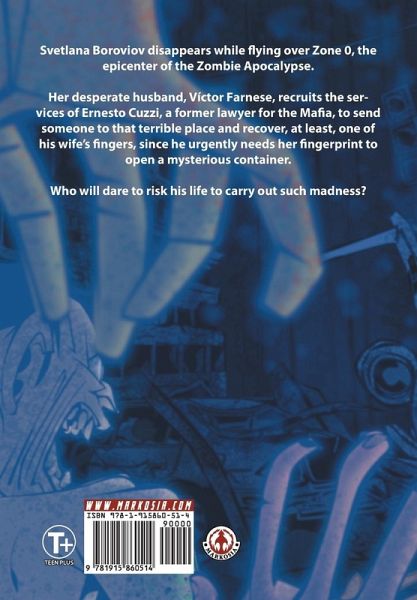 Svetlana Boroviov disappears while flying over Zone 0, the epicenter of the Zombie Apocalypse. Her desperate husband, Víctor Farnese, recruits the ser-vices of Ernesto Cuzzi, a former lawyer for the Mafia, to send someone to that terrible place and recover, at least, one of his wife's fingers, since he urgently needs her fingerprint to open a mysterious container. Who will dare to risk his life to carry out such madness?