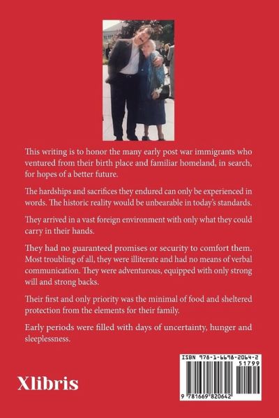 This writing is to honor the many early post war immigrants who ventured from their birth place and familiar homeland, in search, for hopes of a better future. The hardships and sacrifices they endured can only be experienced in words. The historic reality would be unbearable in today's standards. They arrived in a vast foreign environment with only what they could carry in their hands. They had no guaranteed promises or security to comfort them. Most troubling of all, they were illiterate and had no means of verbal communication. They were adventurous, equipped with only strong will and strong backs. Their first and only priority was the minimal of food and sheltered protection from the elements for their family. Early periods were filled with days of uncertainty, hunger and sleeplessness.