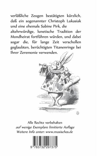 ...verlässliche Zeugen bestätigten kürzlich, die Fortführung der altehrwürdigen, lunetischen Tradition der Mondheirat unter Verwendung der, für lange Zeit verschollen geglaubten, berüchtigten Titanenringe bei der Zeremonie. Zabinae ist ein modernes x-over Märchen, welches direkten Bezug auf den Autor und dessen Hochzeit nimmt, um alle daran teilnehmen zu lassen, die er bis dato noch nicht kannte oder nicht persönlich dabei haben wollte. Das umfasst so ziemlich alle, die im Buch nicht erwähnt wurden, also sagen wir der Einfachheit halber 'Alle', außer sich selber und seiner damals Zukünftigen. Warum Sie dieses Buch lesen sollten? Weil es eigentlich kein Buch, sondern eher ein Büchlein ist und sich gut in einem Rutsch lesen lässt. Es ist auch gut für zwischendurch und macht nicht dick. Es ist eine gute Anleitung für alle, die heiraten möchten oder bei denen das erste Mal danebengegangen ist. Für Schaulustige, Piraten oder Abenteurer, die dabei gerne auf ihrem Sofa sitzen und Tee trinken. Es ist kurz, günstig und regional ...und außerdem zum Wiederlesen geeignet.