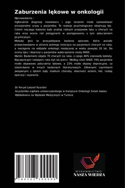 Wprowadzenie :Og¿oszenie diagnozy nowotworu i jego leczenie mo¿e spowodowä emocjonalne urazy u pacjentów. Te reakcje psychologiczne obejmuj¿ l¿k. Celem naszego badania by¿a analiza ró¿nych przejawów l¿ku u chorych na raka oraz ocena roli piel¿gniarki w post¿powaniu z tym zaburzeniem psychicznym.Metody: Jest to prospektywne badanie opisowe, które zostäo przeprowadzone w okresie jednego miesi¿ca na pacjentach chorych na raka, a nast¿pnie na oddziale onkologii medycznej w wieku powy¿ej 20 lat. Do oceny l¿ku i depresji u pacjentów wykorzystano skal¿ HADS.Wyniki: Badaniami obj¿to 70 chorych na raka, z czego 46% stanowi¿y kobiety. Najcz¿stszym rodzajem raka by¿ rak piersi. Wed¿ug skali HADS 74% pacjentów miäo objawowe zaburzenia l¿kowe, a 23% miäo objawy depresyjne, co stwierdzono w innych badaniach literaturowych. G¿ównymi czynnikami zwi¿zanymi z l¿kiem by¿y: stadium choroby, obecno¿¿ astenii, ból, rodzaj operacji i wyznanie.