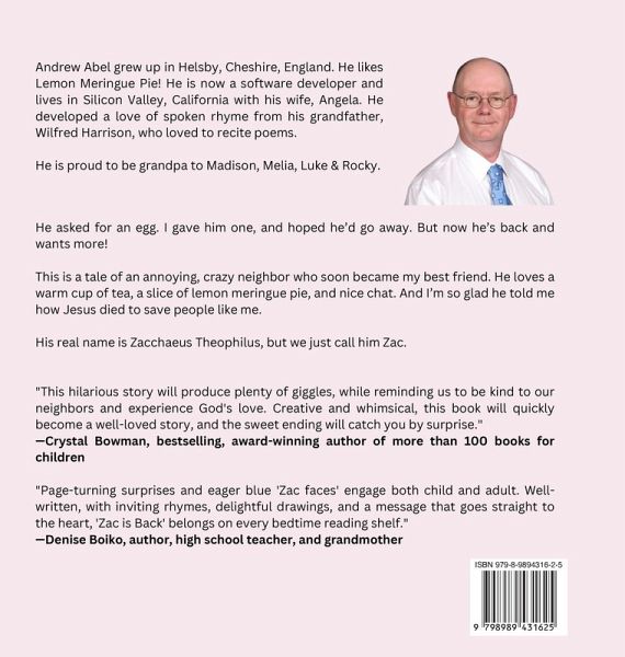 He asked for an egg. I gave him one, and hoped he'd go away. But now he's back and wants more! This is a tale of an annoying, crazy neighbor who soon became my friend. He loves a warm cup of tea, a slice of lemon meringue pie, and nice chat. And I'm so glad he told me how Jesus died to save people like me. His real name is Zacchaeus Theophilus, but we just call him Zac.