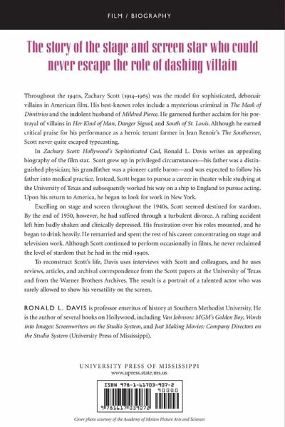Throughout the 1940s, Zachary Scott (1914-1965) was the model for sophisticated, debonair villains in American film. His best-known roles include a mysterious criminal in The Mask of Dimitrios and the indolent husband in Mildred Pierce. He garnered further acclaim for his portrayal of villains in Her Kind of Man, Danger Signal, and South of St. Louis. Although he earned critical praise for his performance as a heroic tenant farmer in Jean Renoir's The Southerner, Scott never quite escaped typecasting. In Zachary Scott: Hollywood's Sophisticated Cad, Ronald L. Davis writes an appealing biography of the film star. Scott grew up in privileged circumstances-his father was a distinguished physician; his grandfather was a pioneer cattle baron-and was expected to follow his father into medical practice. Instead, Scott began to pursue a career in theater while studying at the University of Texas and subsequently worked his way on a ship to England to pursue acting. Upon his return to America, he began to look for work in New York. Excelling on stage and screen throughout the 1940s, Scott seemed destined for stardom. By the end of 1950, however, he had suffered through a turbulent divorce. A rafting accident left him badly shaken and clinically depressed. His frustration over his roles mounted, and he began to drink heavily. He remarried and spent the rest of his career concentrating on stage and television work. Although Scott continued to perform occasionally in films, he never reclaimed the level of stardom that he had in the mid-1940s. To reconstruct Scott's life, Davis uses interviews with Scott and colleagues and reviews, articles, and archival correspondence from the Scott papers at the University of Texas and from the Warner Brothers Archives. The result is a portrait of a talented actor who was rarely allowed to show his versatility on the screen.