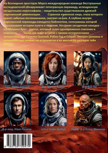 In the desolate expanse of Mars, an international team of intrepid explorers stumbles upon relics that defy time and reason. A five-sided pyramid, etched with cryptic hieroglyphs, stands as a testament to an ancient Martian civilization. An alien stone face, its eyes holding forgotten memories, gazes upon them. And deep within the Martian pyramid lies an information library, holographic pages whispering tales of rise and fall. But the most enigmatic find is the gateway machine - a humming portal that promises both salvation and peril. There are also encounters with historical figures such as Galileo Galilei, Robin Hood and Socrates. Emotions (romances and rivalries) influence the astronauts on their mission to uncover the secrets of Mars.