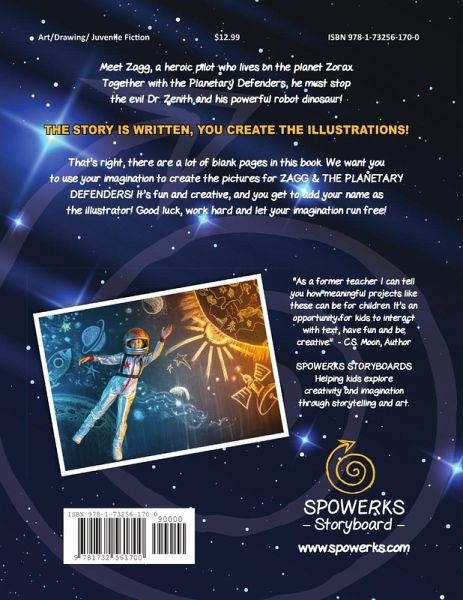Meet Zagg, a heroic pilot who lives on the planet Zorax. Together with the Planetary Defenders, he must stop the evil Dr. Zenith and his powerful robot dinosaur! Prose and poetry combine in this story for kids ages 9-12. But while the story is written, you create the illustrations! That's right, there are a lot of blank pages in this book. We want you to use your imagination to create the pictures for Zagg and his companions!