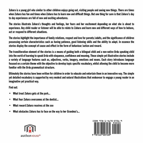 Zahara is a young girl who similar to other children enjoys going out, visiting people and seeing new things. There are times when Zahara has fun and times when Zahara has to learn new and difficult things. But one thing for sure is that Zahara's day to day experiences are full of new and exciting adventures. The stories illustrate Zahara's thoughts and feelings, her fears and her excitement depending on what she is about to experience. Any child reader or listener will be able to relate to Zahara and learn new and different ways of how to behave, act or respond to different situations. The stories highlight the importance of family relations, respect and love for parents/adults, and the significance of children possessing certain characteristics such as having patience, good listening skills and the ability to adapt. In essence the stories display the concept of cause and effect in the form of behaviour/action and reward. The transliteration element of the stories is a means of guiding both a bilingual child and a non-native Urdu speaking child into the world learning to speak Urdu with eloquence, confidence and meaning. These simple yet illustrative stories include a variety of language features such as, adjectives, verbs, imagery, emotions and nouns. Each story introduces language focused on a certain theme with the objective to develop topic specific vocabulary, whilst allowing the child to become more familiar with the Urdu grammatical structure. Ultimately the stories have been written for children in order to educate and entertain them in an innovative way. The simple yet detailed vocabulary is supported by very modest and natural illustrations that endeavour to engage a young reader in an imaginative yet practical way. Find out: ¿ What treat Zahara gets at the park... ¿ What fear Zahara overcomes at the dentist... ¿ What reward Zahara receives at the zoo ¿ What obstacles Zahara has to face on the way to her Grandma's...