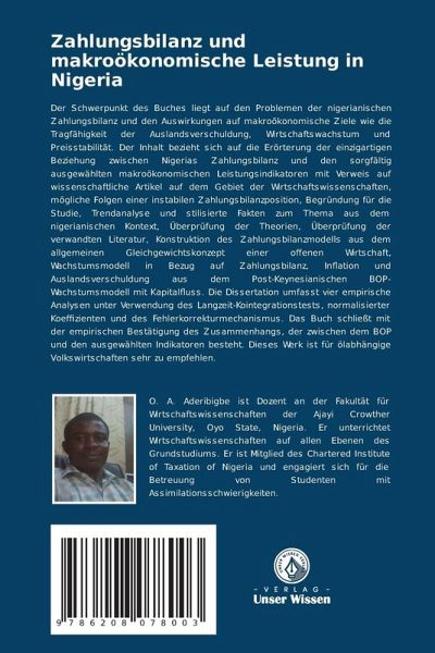 Der Schwerpunkt des Buches liegt auf den Problemen der nigerianischen Zahlungsbilanz und den Auswirkungen auf makroökonomische Ziele wie die Tragfähigkeit der Auslandsverschuldung, Wirtschaftswachstum und Preisstabilität. Der Inhalt bezieht sich auf die Erörterung der einzigartigen Beziehung zwischen Nigerias Zahlungsbilanz und den sorgfältig ausgewählten makroökonomischen Leistungsindikatoren mit Verweis auf wissenschaftliche Artikel auf dem Gebiet der Wirtschaftswissenschaften, mögliche Folgen einer instabilen Zahlungsbilanzposition, Begründung für die Studie, Trendanalyse und stilisierte Fakten zum Thema aus dem nigerianischen Kontext, Überprüfung der Theorien, Überprüfung der verwandten Literatur, Konstruktion des Zahlungsbilanzmodells aus dem allgemeinen Gleichgewichtskonzept einer offenen Wirtschaft, Wachstumsmodell in Bezug auf Zahlungsbilanz, Inflation und Auslandsverschuldung aus dem Post-Keynesianischen BOP-Wachstumsmodell mit Kapitalfluss. Die Dissertation umfasst vierempirische Analysen unter Verwendung des Langzeit-Kointegrationstests, normalisierter Koeffizienten und des Fehlerkorrekturmechanismus. Das Buch schließt mit der empirischen Bestätigung des Zusammenhangs, der zwischen dem BOP und den ausgewählten Indikatoren besteht. Dieses Werk ist für ölabhängige Volkswirtschaften sehr zu empfehlen.