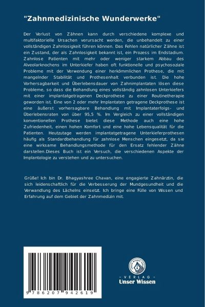 Der Verlust von Zähnen kann durch verschiedene komplexe und multifaktorielle Ursachen verursacht werden, die unbehandelt zu einer vollständigen Zahnlosigkeit führen können. Das Fehlen natürlicher Zähne ist ein Zustand, der als Zahnlosigkeit bekannt ist, ein Prozess im Endstadium. Zahnlose Patienten mit mehr oder weniger starkem Abbau des Alveolarknochens im Unterkiefer haben oft funktionelle und psychosoziale Probleme mit der Verwendung einer herkömmlichen Prothese, die mit mangelnder Stabilität und Prothesenhalt verbunden ist. Die hohe Vorhersagbarkeit und Überlebensdauer von Zahnimplantaten lösen diese Probleme, so dass die Behandlung eines vollständig zahnlosen Unterkiefers mit einer implantatgetragenen Deckprothese zu einer Routinetherapie geworden ist. Eine von 2 oder mehr Implantaten getragene Deckprothese ist eine äußerst vorhersagbare Behandlung mit Implantaterfolgs- und Überlebensraten von über 95,5 %. Im Vergleich zu einer vollständigen konventionellen Prothese bietet diese Methode auch eine hohe Zufriedenheit, einen hohen Komfort und eine hohe Lebensqualität für die Patienten. Heutzutage werden implantatgetragene Unterkieferprothesen häufig als Standardbehandlung für zahnlose Menschen eingesetzt, da sie eine wirksame Behandlungsmethode für den Ersatz fehlender Zähne darstellen.Dieses Buch ist ein Versuch, die verschiedenen Aspekte der Implantologie zu verstehen und zu untersuchen.