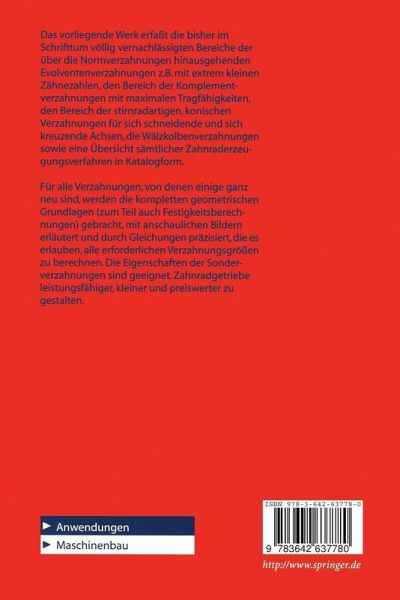 Das vorliegende Werk erfaßt die bisher im Schrifttum völlig vernachlässigten Bereiche der über die Normverzahnungen hinausgehenden Evolventenverzahnungen, z.B. mit extrem kleinen Zähnezahlen, die Komplementverzahnungen mit maximalen Tragfähigkeiten, die stirnradartigen, konischen Verzahnungen für sich schneidende und sich kreuzende Achsen, die Wälzkolbenverzahnungen sowie eine Übersicht sämtlicher Zahnraderzeugungsverfahren in Katalogform. Für alle Verzahnungen werden die kompletten geometrischen Grundlagen (z.T. auch Festigkeitsberechnungen) gebracht, mit anschaulichen Bildern erläutert und durch Gleichungen präzisiert, die es erlauben, alle erforderlichen Verzahnungsgrößen zu berechnen. Die Eigenschaften der Sonderverzahnungen sind geeignet, Zahnradgetriebe leistungsfähiger und preiswerter zu gestalten