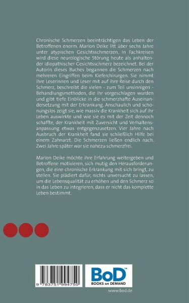 Chronische Schmerzen beeinträchtigen das Leben der Betroffenen enorm. Marion Deike litt über sechs Jahre unter atypischen Gesichtsschmerzen. In Fachkreisen wird diese neurologische Störung heute als anhaltender idiopathischer Gesichtsschmerz bezeichnet. Bei der Autorin dieses Buches begannen die Schmerzen nach mehreren Eingriffen beim Kieferchirurgen. Sie nimmt ihre Leserinnen und Leser mit auf ihre Reise durch den Schmerz, beschreibt die vielen, zum Teil unsinnigen Behandlungsmethoden, die ihr vorgeschlagen wurden und gibt tiefe Einblicke in die schmerzhafte Auseinandersetzung mit der Erkrankung. Anschaulich und schonungslos zeigt sie, wie massiv die Krankheit sich auf ihr Leben auswirkte und wie sie es mit der Zeit dennoch schaffte, der Krankheit mit Zuversicht und Verhaltensanpassung etwas entgegenzusetzen. Vier Jahre nach Ausbruch der Krankheit fand sie schließlich Hilfe bei einem Zahnarzt. Die Schmerzen ließen endlich nach. Zwei Jahre später war sie nahezu schmerzfrei. Marion Deike möchte ihre Erfahrung weitergeben und Betroffene motivieren, sich mutig den Herausforderungen, die eine chronische Erkrankung mit sich bringt, zu stellen. Sie plädiert dafür, nichts unversucht zu lassen, um die Lebensqualität zu erhöhen und den Schmerz so in das Leben zu integrieren, dass er nicht das komplette Leben bestimmt.