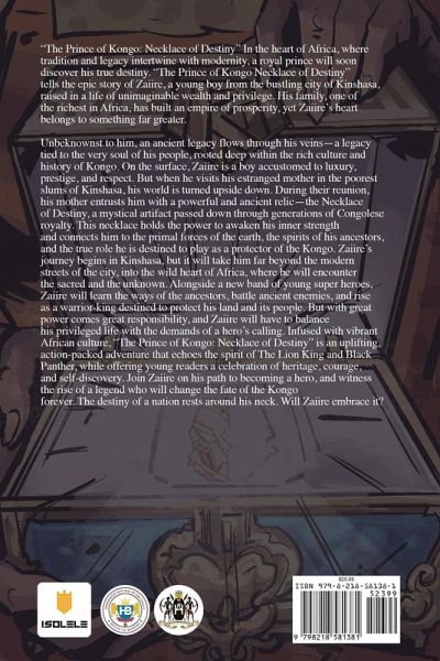 "The Prince of kongo: The Necklace of Destiny" In the heart of Africa, where tradition and legacy intertwine with modernity, a royal prince will soon discover his true destiny. "The Prince of kongo: Necklace of Destiny" tells the epic story of Zaiire, a young boy from the bustling city of Kinshasa, raised in a life of unimaginable wealth and privilege. His family, one of the richest in Africa, has built an empire of prosperity, yet Zaiire's heart belongs to something far greater. Unknown to him, an ancient legacy flows through his veins, a legacy tied to the very soul of his people and rooted deep within the rich culture and history of Kongo. On the surface, Zaiire is a boy accustomed to luxury, prestige, and respect. But when he visits his estranged mother in the poorest slums of Kinshasa, his world is turned upside down. During their reunion, his mother entrusts him with a powerful and ancient relic-the Necklace of Destiny, a mystical artifact passed down through generations of Congolese royalty. This necklace holds the power of time travel to awaken his inner strength and connect him to the primal forces of the earth, the spirits of his ancestors, and the true role he is destined to play as a protector of the Congo. Zaiire's journey begins in Kinshasa, but it will take him far beyond the modern streets of the city, into the wild heart of Africa, where he will encounter the sacred and the unknown. Alongside a new band of young super heroes, Zaiire will learn the ways of the ancestors, battle ancient enemies, and rise as a warrior-king destined to protect his land and its people. But with great power comes great responsibility, and Zaiire will have to balance his privileged life with the demands of a hero's calling. Infused with vibrant African Royalty culture, "The Prince of kongo: Necklace of Destiny" is an uplifting, action-packed adventure that echoes the spirit of The Lion King and Black Panther, while offering young readers a celebration of heritage, african black history, courage, and self-discovery. Readers will embark on a journey to the majestic Palace of the Lost City of King Zola, where Zaiire's father, Shango, met his mother, Kimoya, beneath the revered Madagascar Baobab tree. The vibrant city of Kinshasa features the African Renaissance Monument, Cape Town Stadium, the Ghana Black Star Gate, and the transformed Kingfisher Towers, now an African Gold map tower. Alongside the Kinshasa Interchange and Hillbrow Tower in Johannesburg, the Congo River flows and the Kenyatta International Convention Centre stands tall, blending the essence of Africa in one city. Ganga Zumba, a heroic figure in history, is celebrated for escaping slavery and founding his own kingdom in Brazil. Jameela, with Elegance, Embodies the Iconic sign of the West Coast. Hailing from the sun-soaked shores of California, she captures the vibrant Spirit of Queen Califia. Patrice Lumumba, often called the African Panther, joins the ranks of great warriors like Kimpa Vita, Manikongo, Memnon, Zumbi Quilombo, Dandara, Aqualtune, Zacimba Gaba, Ota Benga, the Leopard Society, The Lyrans, Mobutu, Nicolau l Misaki, Haile Selassie, Mansa musa, Shaka Zulu, Menelik, Ismenie, Makeda, Marcus Garvey, Kandake, piye, Amanirenas, king kufulula, Bapende, Bapedi, Laamsa, mami Wata, Thomas Sankara, Nandi Bhebhe, Moremi Ajasoro, The Mangbetu, Anacaona, Caonabo, and Jomo Kenyatta, Nzinga Ndongo and The African Cosmology. Welcome to the extraordinary realm of real African superheroes, mythology, and sci-fi comics, where stories inspire and empower. Join Zaiire on his path to becoming a hero, and witness the rise of a legend who will change the fate of the Kongo forever. The destiny of a nation rests around his neck. Will Zaiire embrace it?