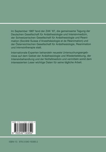 Schock.- Die Wirkung hyperosmolarer und hyperonkotischer Lösungen auf die Organdurchblutung bei Hypotension und Schock.- Verhalten des extravaskulären Lungenwassers unter initialer Volumentherapie mit Elektrolytlösungen im frühen septischen Schock.- 7.5% NaCl/Dextran 70 Solution in the Prehospital Care of the Trauma Patient.- Notfallmedizin.- Neue experimentelle und klinische Befunde zur kardiopulmonalen Reanimation.- Präklinische Reanimation - Ergebnisse aus dem internationalen Bereich.- Neue Ergebnisse der präklinischen Reanimation in der Bundesrepublik Deutschland.- Klinische Reanimation - Möglichkeiten und Grenzen.- Die Basismaßnahmen der kardiopulmonalen Reanimation.- Der polytraumatisierte und neurochirurgische Patient.- Prioritäten in der chirurgischen Versorgung des polytraumatisierten Patienten.- Die Aussagekraft von Trauma-Scores zur Beurteilung des Schweregrades.- Der traumatische Schock: Antwort auf Hypovolämie und Gewebstrauma.- Schmerz als zentrales Problem in der Behandlung des Polytraumatisierten.- Der Einsatz spezieller Methoden in der Diagnostik und zur Verlaufskontrolle bei polytraumatisierten Patienten.- Stabilisierung und Substitution der Nierenfunktion beim Polytraumatisierten.- Radiologische Diagnostik beim Schädel-Hirn-Trauma und bei zerebralen Notfällen (CT, MRT, ECT).- Aktuelle Anästhetika und Anästhesieverfahren beim zerebral gefährdeten neurochirurgischen Patienten.- Spezielle Anästhesieverfahren in der Neurochirurgie.- EEG und evozierte Potentiale in der zerebralen ßberwachung bei neurochirurgischen Eingriffen und in der Intensivtherapie des Schädel-Him-Traumas.- Elektrophysiologische Befunde bei inkompletter experimenteller zerebraler Ischämie.- Intensivtherapie nach neurochirurgischen Eingriffen und beiSchädel-Hirn-Trauma.- Zusammenfassung und Schlußwort - "Der neurochirurgische Patient".- Schmerztherapie und postoperative Analgesie.- Schmerzverständnis und Schmerzbekämpfung in Antike, Mittelalter und in den letzten Jahrhunderten.- Schmerztherapie auf einer Palliativstation - Ein Modellversuch.- Gegenirritationsverfahren zur Schmerztherapie.- Schmerzbehandlung im Rettungswesen.- Wechselwirkungen zwischen peripher und zentral wirksamen Analgetika.- Postoperative Regionalanästhesie.- Regionalanästhesie.- Wie sinnvoll ist die Kombination von Lokalanästhetika - Pharmakokinetische und pharmakodynamische Aspekte.- Der postoperative Kopfschmerz: Ursachen, Häufigkeit, Therapie und Prävention.- Wahl und Dosierung von Lokalanästhetika bei der geburtshilflichen Leitungsanästhesie.- Welche obere Plexusanästhesie?.- Anästhesie in Gynäkologie und Geburtshilfe; Thorax-, Herz- und Gefäßchirurgie.- Die "Bupivacain-Story" in der Geburtshilfe: Müssen Konsequenzen gezogen werden?.- Häufigkeit und klinische Bedeutung der mangelhaften Bewußtseinsausschaltung während der Sectio-Narkose.- Monitoring bei Präeklampsie und Eklampsie.- Derzeitiger Stand der Prävention der Aspirationspneumonie bei geburtshilflichen Allgemeinnarkosen.- Die präoperative Befundung bei thoraxchirurgischen Patienten.- Oxygenation During One-Lung Anaesthesia.- Kinderanästhesie.- Das Kind mit banalem Infekt resp. mit rezidivierendem Pseudokrupp - Eine ßbersicht.- Das Kind mit banalem Infekt resp. mit rezidivierendem Pseudokrupp - Anästhesieprobleme.- Das Kind mit angeborenem (operiertem oder nicht operiertem) Herzvitium - Eine ßbersicht.- Das Kind mit angeborenem (operiertem oder nicht operiertem) Herzvitium - Narkoseprobleme.- Das retardierte Kind - Eine ßbersicht.- Das retardierteKind - Narkoseprobleme.- Das Kind mit neuromuskulärer Krankheit - ßbersicht.- Das Kind mit neuromuskulärer Krankheit - Narkoseprobleme.- Narkose für Laryngo-, Tracheo- Bronchoskopie und Bronchographie bei Kindern - Narkoseprobleme.- Der medikamentös vorbehandelte Patient.- Was wissen wir wirklich über unsere Arzneimittel?.- Spezielle Anästhesieprobleme bei neurologisch Kranken.- Anästhesie bei Hypertonikern: Welche Gesichtspunkte verdienen besondere Beachtung?.- Anästhetika und Begleitmedikation - Gibt es klinisch relevante Interaktionen?.- Anästhesie bei diagnostischen Eingriffen.- Anästhesie bei der angiologischen Diagnostik.- Anästhesie bei der gynäkologischen Diagnostik.- Anästhesie für Bronchoskopie, Bronchographie und Mediastinoskopie.- Anästhesie bei diagnostischen Eingriffen in der Pädiatrie.- Physikalisch-technische Prinzipien der Kernspintomographie.- EKG-Veränderungen bei der Kernspintomographie.- Anästhesiologische Aspekte bei der Kernspintomographie.- Intravenöse Narkose zur Kernspintomographie (KST).- Der ambulante Patient.- Besonderheiten der ambulanten Anästhesie.- Voruntersuchungen des ambulanten Patienten.- Zur Prämedikation des ambulanten Patienten.- Anästhesieverfahren beim ambulanten Patienten.- Narkose in der ärztlichen Praxis.- Probleme der Verkehrssicherheit nach ambulanter Anästhesie.- Rechtliche Aspekte bei ambulanter Anästhesie.