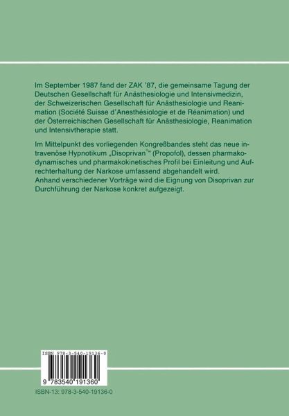 Klinische Pharmakologie von Propofol als Grundlage für eine optimierte Infusionsdosierung.- Totale intravenöse Anästhesie mittels interaktiver Infusionsdosierung von Propofol und Alfentanil.- Einfluß von Disoprivan und Disoprivan + Fentanyl auf hämodynamische Parameter beim Menschen.- Der Einfluß von Fentanyl und endotrachealer Intubation auf die hämodynamischen Effekte der Anästhesieeinleitung mit Propofol/N2O beim Menschen.- Wirkungen von Propofol auf Hämodynamik, Koronardurchblutung und myokardialen Sauerstoffverbrauch geriatrischer Patienten: Ein Vergleich mit Etomidat.- Das Verhalten des Plasmahistaminspiegels nach der Einleitung der Anästhesie mit Propofol.- Erste klinische Erfahrungen mit Propofol.- Narkoseeinleitung und Unterhaltung mit Propofol (Disoprivan) i.v..- Propofol (Disoprivan) und Fentanyl für gynäkologische Kurzeingriffe.- Vergleichende Untersuchung diverser intravenöser Narkosen für kleine gynäkologische Eingriffe.- Propofol (Disoprivan) bei urologischen Eingriffen.- Kombinationsanästhesie mit Propofol, Alfentanil und Vecuronium für mikrolaryngoskopische Eingriffe.- Use of Disoprivan (Propofol) for the Maintenance of Anaesthesia.- Das Verhalten der Hämodynamik unter Dauerinfusion von Propofol bei großen gefäßchirurgischen Operationen.- Propofol senkt den Liquordruck während Ethrane-N2O-O2-Narkose.- Wie häufig kann eine Nebenwirkung bei Propofol-(Disoprivan-)Maskennarkosen erwartet werden? Eine statistische Hochrechnung.- Propofol (Disoprivan) zur Sedierung bei Regionalanästhesie.