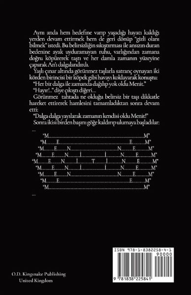 Ayn¿ anda hem hedefine var¿p yäad¿¿¿ hayat¿ kald¿¿¿ yerden devam ettirmek hem de geri dönüp "gizli olan¿ bilmek" istedi. Bu belirsizli¿in s¿k¿¿t¿rmas¿ ile ans¿z¿n duran bedenine ayak uyduramayan ruhu, varl¿¿¿ndan zamana döru köpürerek tät¿ ve her damla zaman¿n yüzeyine çarparak An'¿ dalgaland¿rd¿. Yäl¿ ç¿nar alt¿nda görünmez tälarla satranç oynayan iki körden birincisi köpek gibi havay¿ koklayarak konütu: "Her bir dalga ile zamanda dä¿l¿p yok oldu Menit." "Hay¿r!.." diye ç¿k¿¿t¿ di¿eri... Görünmez tahtada ne oldüu belirsiz bir tä¿ dikkatle hareket ettirerek hamlesini tamamlad¿ktan sonra devam etti: "Dalga dalga yay¿larak zaman¿n kendisi oldu Menit!" Sonra ikisi birden bä¿n¿ gö¿e kald¿r¿p ulumaya bälad¿lar...