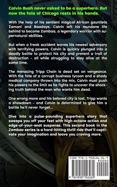 Calvin Bush never asked to be a superhero. But now the fate of Chicago rests in his hands. With the help of his sentient magical African gauntlets Zamani and Baadaye, Calvin left his mundane life behind to become Zambaa, a legendary warrior with supernatural abilities. But when a freak accident leaves his newest adversary with terrifying powers, Calvin is quickly plunged into a deadly battle to protect his city and prevent a trail of destruction - all while struggling to stay alive at the same time. The menacing Tripp Chain is dead set on vengeance. With the fate of a corrupt business tycoon and a shady medical company thrown into the mix, Calvin must push his powers to the limit as he fights to uncover the shocking truth behind the man who wants him dead. One wrong move and his beloved city is lost. Tripp wants a showdown - and Calvin is determined to give him a battle he'll never forget... Dive into a pulse-pounding superhero story that sweeps you off your feet with high-octane action and edge-of-your-seat suspense. This second book in the Zambaa series is a hard-hitting thrill ride that's perfect for fans of classic superhero comics like Marvel's Black Panther. Order your copy now...