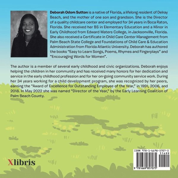 Deborah Odom Sutton is a native of Florida and a lifelong resident of Delray Beach. The mother of one son and one grandson. She is the Director of a quality childcare center in Boca Raton, Florida. She received her BS in Elementary Education and a Minor in Early Childhood from Edward Waters College, in Jacksonville, Florida. She also received a Certificate in Child Care Center Management from Palm Beach State College and Foundations of Child Care & Education Administration from Florida Atlantic University. Deborah has authored the books "Easy to Learn Songs, Poems, Rhymes and Fingerplays" and "Encouraging Words for Women." The author is a member of several early childhood and civic organizations. Deborah enjoys helping the underprivileged children in her community and has received many honors for her dedication and service in the early childhood profession and for her on-going community service work. Deborah was named "Director of the Year" from the Early Learning Coalition of Palm Beach County. May 2022.