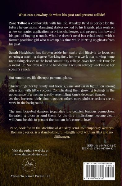 What can a cowboy do when his past and present collide? Zane Talbot is comfortable with his life. Whiskey Bend is perfect for the future he envisions. Managing stables owned by his friends, plus work on a new computer application, provides challenges, and propels him toward his goal of buying a ranch. What he doesn't need is a relationship with a former goodtime girl who takes up his time while stirring up ghosts from his past. Sarah Hutchison has thrown aside her party girl lifestyle to focus on earning a teaching degree. Working forty hours a week at a nursing home and taking classes at the local community college leaves her little time for a social life. Not even with the handsome, taciturn cowboy working at her cousin's ranch. But sometimes, life disrupts personal plans. Thrown together by family and friends, Zane and Sarah fight their strong attraction with little success. Complicating their growing feelings is the appearance of a woman greatly resembling Zane's deceased fiancée. As they increase their time together, other, more sinister actions are at work in the background. The unanticipated dangers jeopardize the couple's tenuous connection, threatening those around them. As the dire implications become clear, will Zane be able to protect the woman he's come to love? Zane, book five in the Macklins of Whiskey Bend Contemporary Western Romance series, is a stand-alone, full-length novel with an HEA and no cliffhanger.