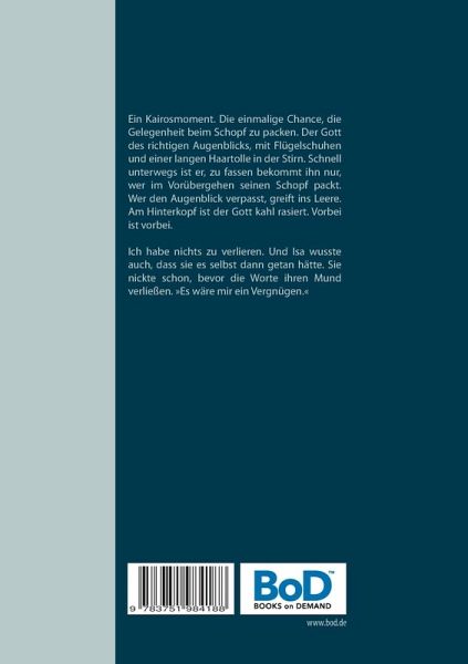 Ein Kairosmoment. Die einmalige Chance, die Gelegenheit beim Schopf zu packen. Der Gott des richtigen Augenblicks, mit Flügelschuhen und einer langen Haartolle in der Stirn. Schnell unterwegs ist er, zu fassen bekommt ihn nur, wer im Vorübergehen seinen Schopf packt. Wer den Augenblick verpasst, greift ins Leere. Am Hinterkopf ist der Gott kahl rasiert. Vorbei ist vorbei. Ich habe nichts zu verlieren. Und Isa wusste auch, dass sie es selbst dann getan hätte. Sie nickte schon, bevor die Worte ihren Mund verließen. »Es wäre mir ein Vergnügen.«