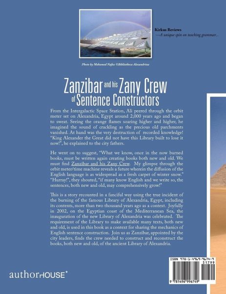 From the Intergalactic Space Station, Ali peered through the orbit meter set on Alexandria, Egypt around 2,000 years ago and began to sweat. Seeing the orange flames soaring higher and higher, he imagined the sound of crackling as the precious old parchments vanished. At hand was the very destruction of recorded knowledge! ?King Alexander the Great did not have this Library built to lose it now!?, he explained to the city fathers. He went on to suggest, ?What we know, once in the now burned books, must be written again creating books both new and old. We must find Zanzibar and his Zany Crew. My glimpse through the orbit meter/time machine reveals a future wherein the diffusion of the English language is as widespread as a fresh carpet of winter snow.? ?Hurray!?, they shouted, ?if many know English and we write so, the sentences, both new and old, may comprehensively grow!? This is a story recounted in a fanciful way using the true incident of the burning of the famous Library of Alexandria, Egypt, including its contents, more than two thousand years ago as a context. Joyfully in 2008, on the Egyptian coast of the Mediterranean Sea, the inauguration of the new Library of Alexandria was celebrated. The requirement of the Library to make available many texts, both new and old, is used in this book as a context for sharing the mechanics of English sentence construction. Join us as Zanzibar, appointed by the city leaders, finds the crew needed to construct and reconstruct the books, both new and old, of the ancient Library of Alexandria.