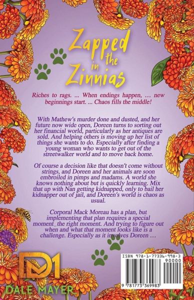 Riches to rags. ... When endings happen, ... new beginnings start. ... Chaos fills the middle! With Mathew's murder done and dusted, and her future now wide open, Doreen turns to sorting out her financial world, particularly as her antiques are sold. And helping others is moving up her list of things she wants to do. Especially after finding a young woman who wants to get out of the streetwalker world and to move back home. Of course a decision like that doesn't come without strings, and Doreen and her animals are soon embroiled in pimps and madams. A world she knows nothing about but is quickly learning. Mix that up with Nan getting kidnapped, only to bail her kidnapper out of jail, and Doreen's world is chaos as usual. Corporal Mack Moreau has a plan, but implementing that plan requires a special moment-the right moment. And trying to figure out when and what that moment looks like is a challenge. Especially as it involves Doreen ...