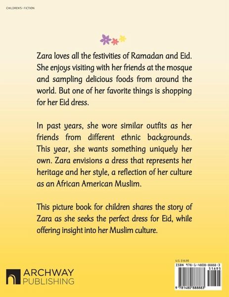 Zara loves all the festivities of Ramadan and Eid. She enjoys visiting with her friends at the mosque and sampling delicious foods from around the world. But one of her favorite things is shopping for her Eid dress. In past years, she wore similar outfits as her friends from different ethnic backgrounds. This year, she wants something uniquely her own. Zara envisions a dress that represents her heritage and her style, a reflection of her culture as an African American Muslim. This picture book for children shares the story of Zara as she seeks the perfect dress for Eid, while offering insight into her Muslim culture.