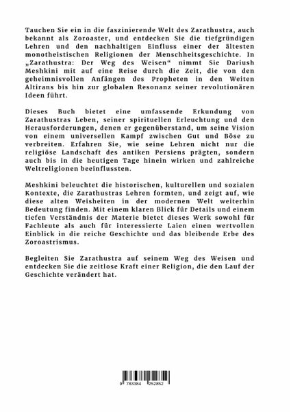 Tauchen Sie ein in die faszinierende Welt des Zarathustra, auch bekannt als Zoroaster, und entdecken Sie die tiefgründigen Lehren und den nachhaltigen Einfluss einer der ältesten monotheistischen Religionen der Menschheitsgeschichte. In "Zarathustra: Der Weg des Weisen" nimmt Sie Dariush Meshkini mit auf eine Reise durch die Zeit, die von den geheimnisvollen Anfängen des Propheten in den Weiten Altirans bis hin zur globalen Resonanz seiner revolutionären Ideen führt.Dieses Buch bietet eine umfassende Erkundung von Zarathustras Leben, seiner spirituellen Erleuchtung und den Herausforderungen, denen er gegenüberstand, um seine Vision von einem universellen Kampf zwischen Gut und Böse zu verbreiten. Erfahren Sie, wie seine Lehren nicht nur die religiöse Landschaft des antiken Persiens prägten, sondern auch bis in die heutigen Tage hinein wirken und zahlreiche Weltreligionen beeinflussten.Meshkini beleuchtet die historischen, kulturellen und sozialen Kontexte, die Zarathustras Lehrenformten, und zeigt auf, wie diese alten Weisheiten in der modernen Welt weiterhin Bedeutung finden. Mit einem klaren Blick für Details und einem tiefen Verständnis der Materie bietet dieses Werk sowohl für Fachleute als auch für interessierte Laien einen wertvollen Einblick in die reiche Geschichte und das bleibende Erbe des Zoroastrismus.Begleiten Sie Zarathustra auf seinem Weg des Weisen und entdecken Sie die zeitlose Kraft einer Religion, die den Lauf der Geschichte verändert hat.