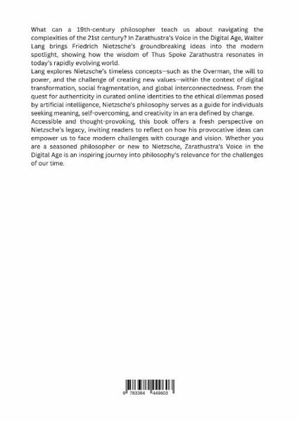 What can a 19th-century philosopher teach us about navigating the complexities of the 21st century? In Zarathustra's Voice in the Digital Age, Walter Lang brings Friedrich Nietzsche's groundbreaking ideas into the modern spotlight, showing how the wisdom of Thus Spoke Zarathustra resonates in today's rapidly evolving world.Lang explores Nietzsche's timeless concepts-such as the Overman, the will to power, and the challenge of creating new values-within the context of digital transformation, social fragmentation, and global interconnectedness. From the quest for authenticity in curated online identities to the ethical dilemmas posed by artificial intelligence, Nietzsche's philosophy serves as a guide for individuals seeking meaning, self-overcoming, and creativity in an era defined by change.Accessible and thought-provoking, this book offers a fresh perspective on Nietzsche's legacy, inviting readers to reflect on how his provocative ideas can empower us to face modern challenges with courage and vision. Whether you are a seasoned philosopher or new to Nietzsche, Zarathustra's Voice in the Digital Age is an inspiring journey into philosophy's relevance for the challenges of our time.