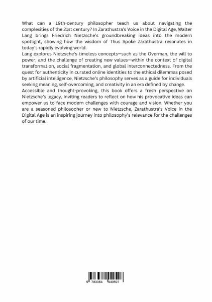 What can a 19th-century philosopher teach us about navigating the complexities of the 21st century? In Zarathustra's Voice in the Digital Age, Walter Lang brings Friedrich Nietzsche's groundbreaking ideas into the modern spotlight, showing how the wisdom of Thus Spoke Zarathustra resonates in today's rapidly evolving world.Lang explores Nietzsche's timeless concepts-such as the Overman, the will to power, and the challenge of creating new values-within the context of digital transformation, social fragmentation, and global interconnectedness. From the quest for authenticity in curated online identities to the ethical dilemmas posed by artificial intelligence, Nietzsche's philosophy serves as a guide for individuals seeking meaning, self-overcoming, and creativity in an era defined by change.Accessible and thought-provoking, this book offers a fresh perspective on Nietzsche's legacy, inviting readers to reflect on how his provocative ideas can empower us to face modern challenges with courage and vision. Whether you are a seasoned philosopher or new to Nietzsche, Zarathustra's Voice in the Digital Age is an inspiring journey into philosophy's relevance for the challenges of our time.