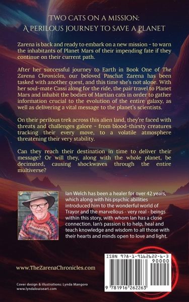 Two cats on a mission: A perilous journey to save a planet Zarena is back and ready to embark on a new mission - to warn the inhabitants of planet Mars of their impending fate if they continue to follow on their current path. After her successful journey to Earth in book one of The Zarena Chronicles, our beloved paschat Zarena has been tasked with another quest, and this time she's not alone. With her soul-mate Cassi along for the ride, the pair travel to planet Mars and inhabit the bodies of Martian cats in order to gather information crucial to the evolution of the entire galaxy, as well as delivering a vital message to the planet's scientists. On their perilous trek across this alien land, they are faced with threats and challenges galore - from blood-thirsty creatures tracking their every move, to a volatile atmosphere threatening their very stability. Can they reach their destination in time to deliver their message? Or will they, along with the whole planet, be decimated, causing shockwaves through the entire multiverse? Author of The Zarena Chronicles, Ian Welch, has been a healer for over 42 years, which along with his psychic abilities introduced him to the wonderful word of Trayor and the marvellous - very real - beings within this story, with who Ian has a close connection. Ian's passion is to help, heal and teach knowledge and wisdom to all those with their hearts and minds open to love and light.