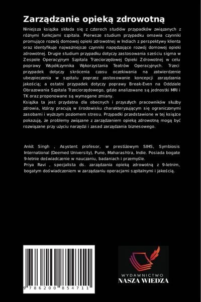 Niniejsza ksi¿¿ka sk¿ada si¿ z czterech studiów przypadków zwi¿zanych z ró¿nymi funkcjami szpitala. Pierwsze studium przypadku omawia czynniki promuj¿ce rozwój domowej opieki zdrowotnej w Indiach z perspektywy klienta oraz identyfikuje najwäniejsze czynniki nap¿dzaj¿ce rozwój domowej opieki zdrowotnej. Drugie studium przypadku dotyczy zastosowania sze¿ciu sigma w Zespole Operacyjnym Szpitala Trzeciorz¿dowej Opieki Zdrowotnej w celu poprawy Wspó¿czynnika Wykorzystania Teatrów Operacyjnych. Trzeci przypadek dotyczy skrócenia czasu oczekiwania na zatwierdzenie ubezpieczenia w szpitalu poprzez zastosowanie koncepcji zarz¿dzania jako¿ci¿; a ostatni przypadek dotyczy poprawy Break-Even na Oddziale Obrazowania Szpitala Trzeciorz¿dowego, gdzie analizowane s¿ jednostki MRI i TK oraz proponowane s¿ wymagane zmiany.Ksi¿¿ka ta jest przydatna dla obecnych i przysz¿ych pracowników s¿u¿by zdrowia, którzy pracuj¿ w ¿rodowisku charakteryzuj¿cym si¿ ograniczonymi zasobami i wy¿szym poziomem stresu. Przypadki przedstawione w tej ksi¿¿ce pokazuj¿, ¿e problemy zwi¿zane z zarz¿dzaniem opiek¿ zdrowotn¿ mog¿ by¿ rozwi¿zane przy u¿yciu narz¿dzi i zasad zarz¿dzania biznesowego.