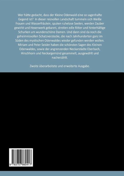 Wer hätte gedacht, dass der Kleine Odenwald eine so sagenhafte Gegend ist? In dieser reizvollen Landschaft tummeln sich Weiße Frauen und Wasserfräulein, spuken ruhelose Seelen, werden Zauber gewirkt und Hexenwerk gebannt, streiten edle Ritter und hinterhältige Schurken um wunderschöne Damen. Und dann sind da noch die geheimnisvollen Schatzverstecke, die nach Jahrhunderten ganz im Süden des mystischen Odenwaldes wieder gefunden werden wollen.Miriam und Peter Seisler haben 90 der schönsten Sagen des Kleinen Odenwaldes, sowie der angrenzenden Neckarstädte Eberbach, Hirschhorn und Neckargemünd gesammelt, ausgewählt und nacherzählt.