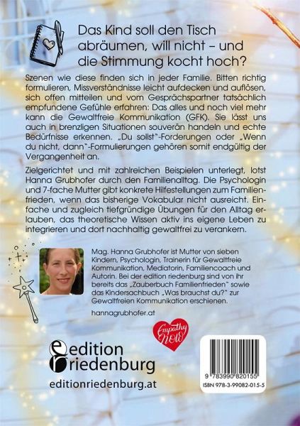Das Kind soll den Tisch abräumen, will nicht - und die Stimmung kocht hoch? Szenen wie diese finden sich in jeder Familie. Bitten richtig formulieren, Missverständnisse leicht aufdecken und auflösen, sich offen mitteilen und vom Gesprächspartner tatsächlich empfundene Gefühle erfahren: Das alles und noch viel mehr kann die Gewaltfreie Kommunikation (GFK). Sie lässt uns auch in brenzligen Situationen souverän handeln und echte Bedürfnisse erkennen. "Du sollst"-Forderungen oder "Wenn du nicht, dann"-Formulierungen gehören somit endgültig der Vergangenheit an.Zielgerichtet und mit zahlreichen Beispielen unterlegt, lotst Hanna Grubhofer durch den Familienalltag. Die Psychologin und 7-fache Mutter gibt konkrete Hilfestellungen zum Familienfrieden, wenn das bisherige Vokabular nicht ausreicht. Einfache und zugleich tiefgründige Übungen für den Alltag erlauben, das theoretische Wissen aktiv ins eigene Leben zu integrieren und dort nachhaltig gewaltfrei zu verankern.Verlag edition riedenburg, Salzburg _ editionriedenburg.at _