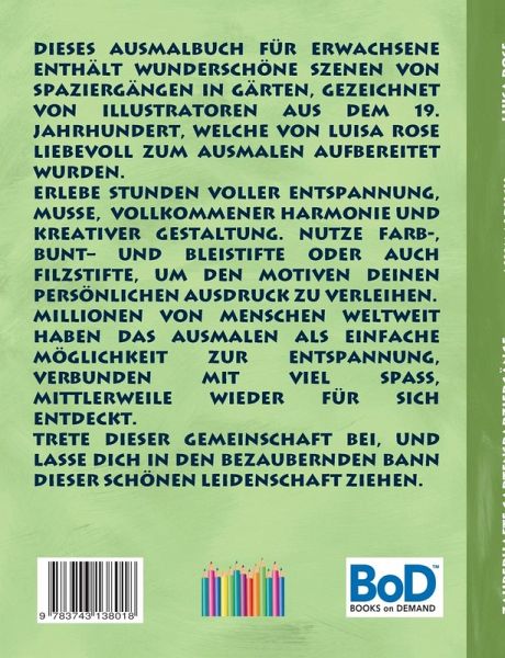 Dieses Ausmalbuch für Erwachsene enthält wunderschöne Szenen von Spaziergängen in Gärten, gezeichnet von Illustratoren aus dem 19. Jahrhundert, welche von Luisa Rose liebevoll zum Ausmalen aufbereitet wurden. Erlebe Stunden voller Entspannung, Muße, vollkommener Harmonie und kreativer Gestaltung. Nutze Farb-, Bunt- und Bleistifte oder auch Filzstifte, um den Motiven deinen persönlichen Ausdruck zu verleihen.Millionen von Menschen weltweit haben das Ausmalen als einfache Möglichkeit zur Entspannung, verbunden mit viel Spaß, mittlerweile wieder für sich entdeckt. Trete dieser Gemeinschaft bei, und lasse dich in den bezaubernden Bann dieser schönen Leidenschaft ziehen.