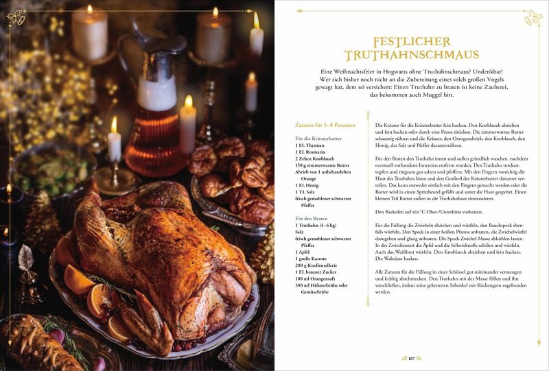 Essen und Trinken wie in Harry Potters Welt: Was wäre diese magische Welt ohne die festlichen Gelage in Hogwarts, kulinarische Ausflüge nach Hogsmeade, die herzhaften Speisen im Fuchsbau und die ein oder andere Tasse Tee in Hagrids Hütte? Zur Weihnachtszeit ist sie von besonders köstlichen Düften erfüllt. Truthahn, buttrige Erbsen, Preiselbeersauce, Plumpudding, Butterbier und noch viel mehr - wem würde da nicht das Wasser im Munde zusammenlaufen? Weihnachten ist zauberhaft!