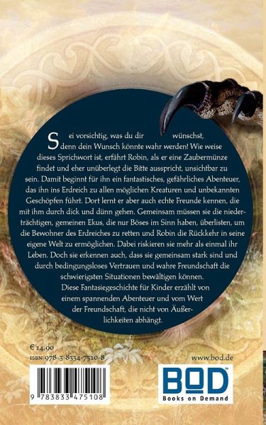 Sei vorsichtig, was du dir wünschst, denn dein Wunsch könnte wahr werden! Wie weise dieses Sprichwort ist, erfährt Robin, als er eine Zaubermünze findet und eher unüberlegt die Bitte ausspricht, unsichtbar zu sein. Damit beginnt für ihn ein fantastisches, gefährliches Abenteuer, das ihn ins Erdreich zu allen möglichen Kreaturen und unbekannten Geschöpfen führt. Dort lernt er aber auch echte Freunde kennen, die mit ihm durch dick und dünn gehen. Gemeinsam müssen sie die niederträchtigen, gemeinen Ekus, die nur Böses im Sinn haben, überlisten, um die Bewohner des Erdreiches zu retten und Robin die Rückkehr in seine eigene Welt zu ermöglichen. Dabei riskieren sie mehr als einmal ihr Leben. Doch sie erkennen auch, dass sie gemeinsam stark sind und durch bedingungsloses Vertrauen und wahre Freundschaft die schwierigsten Situationen bewältigen können. Diese Fantasiegeschichte für Kinder erzählt von einem spannenden Abenteuer und vom Wert der Freundschaft, die nicht von Äußerlichkeiten abhängt.