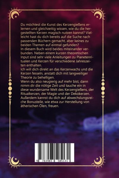 Zaubere mit selbst gegossenen Kerzen und erwecke die Hexe in dir!Willst du wissen, wie du mit selbst gegossenen Kerzen ein tolles Sonnenritual abhalten kannst? Wie du deine eigene Spell Candle selbst herstellen kannst und wozu diese nützlich ist? Du hast jedoch keine Ahnung vom Kerzengießen?Dann lasse dich von meinem Buch leiten. Ich habe bewusst auf viel Theorie und Geschichte verzichtet und komme direkt zum Wesentlichen: der Kunst des Kerzengießens. An und für sich ist das keine große Hexerei. Du musst lediglich einige magische Zutaten besorgen und mit einem Quäntchen Fingerspitzengefühl…mehr