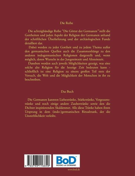 Die ReiheDie achtzigbändige Reihe "Die Götter der Germanen'"stellt die Gottheiten und jeden Aspekt der Religion der Germanen anhand der schriftlichen Überlieferung und der archäologischen Funde detailliert dar.Dabei werden zu jeder Gottheit und zu jedem Thema außer den germanischen Quellen auch die Zusammenhänge zu den anderen indogermanischen Religionen dargestellt und, wenn möglich, deren Wurzeln in der Jungsteinzeit und Altsteinzeit.Daneben werden auch jeweils Möglichkeiten gezeigt, was eine solche alte Religion für die heutige Zeit bedeuten kann - schließlich ist eine Religion zu einem großen Teil stets der Versuch, die Welt und die Möglichkeit der Menschen in ihr zu beschreiben.Das Buch Die Germanen kannten Liebestränke, Stärketränke, Vergessenstränke und noch einige andere Zaubertränke sowie den die Dichter inspirierenden Skaldenmet. Alle diese Tränke haben ihren Ursprung in dem (indo-)germanischen Ritualtrank, der die Unsterblichkeit verleiht.