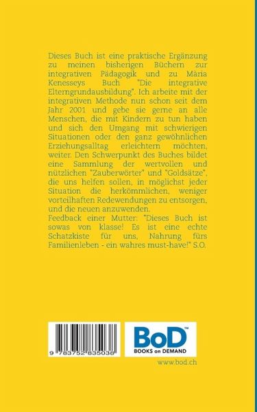 Dieses Buch ist eine praktische Ergänzung zu meinen bisherigen Büchern zur integrativen Pädagogik und zu Mària Kenesseys Buch "Die integrative Elterngrundausbildung". Ich arbeite mit der integrativen Methode nun schon seit dem Jahr 2001 mit Freude und gebe sie gerne an alle Menschen, die mit Kindern zu tun haben und sich den Umgang mit schwierigen Situationen oder den ganz gewöhnlichen Erziehungsalltag erleichtern, das Klima verbessern und die Beziehung zum Kind stärken möchten, weiter. Den Schwerpunkt des Buches bildet eine Sammlung der wertvollen und nützlichen "Zauberwörter" und "Goldsätze", die uns helfen sollen, in möglichst jeder Situation die herkömmlichen, weniger vorteilhaften Redewendungen zu entsorgen, und die neuen anzuwenden. Eine echte Erleichterung im Familienalltag.