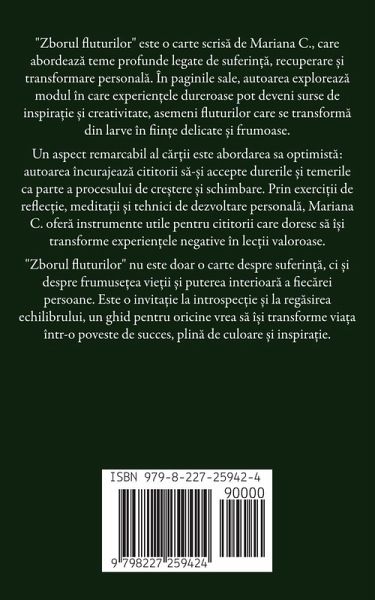 "Zborul fluturilor" este o carte scris¿ de Mariana C., care abordeaz¿ teme profunde legate de suferin¿¿, recuperare ¿i transformare personal¿. În paginile sale, autoarea exploreaz¿ modul în care experien¿ele dureroase pot deveni surse de inspiräie ¿i creativitate, asemeni fluturilor care se transform¿ din larve în fiin¿e delicate ¿i frumoase. Un aspect remarcabil al c¿r¿ii este abordarea sa optimist¿: autoarea încurajeaz¿ cititorii s¿-¿i accepte durerile ¿i temerile ca parte a procesului de cre¿tere ¿i schimbare. Prin exerci¿ii de reflec¿ie, meditäii ¿i tehnici de dezvoltare personal¿, Mariana C. ofer¿ instrumente utile pentru cititorii care doresc s¿ î¿i transforme experien¿ele negative în lec¿ii valoroase. "Zborul fluturilor" nu este doar o carte despre suferin¿¿, ci ¿i despre frumuse¿ea vie¿ii ¿i puterea interioar¿ a fiec¿rei persoane. Este o invitäie la introspec¿ie ¿i la reg¿sirea echilibrului, un ghid pentru oricine vrea s¿ î¿i transforme viäa într-o poveste de succes, plin¿ de culoare ¿i inspiräie.