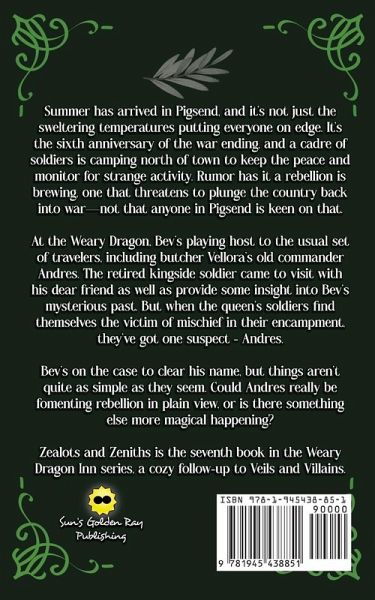 Summer has arrived in Pigsend, and it's not just the sweltering temperatures putting everyone on edge. It's the sixth anniversary of the war ending, and a cadre of soldiers is camping north of town to keep the peace and monitor for strange activity. Rumor has it a rebellion is brewing, one that threatens to plunge the country back into war-not that anyone in Pigsend is keen on that. At the Weary Dragon, Bev's playing host to the usual set of travelers, including butcher Vellora's old commander Andres. The retired kingside soldier came to visit with his dear friend as well as provide some insight into Bev's mysterious past. But when the queen's soldiers find themselves the victim of mischief in their encampment, they've got one suspect - Andres. Bev's on the case to clear his name, but things aren't quite as simple as they seem. Could Andres really be fomenting rebellion in plain view, or is there something else more magical happening? Zealots and Zeniths is the seventh book in the Weary Dragon Inn series, a cozy follow-up to Veils and Villains.