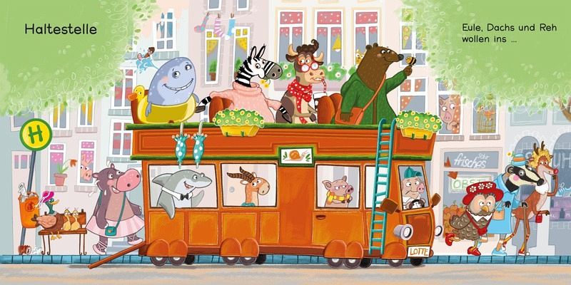 An der Haltestelle ist tierisch was los: Hier warten viele deiner Lieblingstiere und jede Menge Reime-Spaß auf dich! Welche Tiere steigen in den Bus ein? Was ist die nächste Station? Wer steigt an der Rollschuhbahn aus? Und wer will wohl ins Kino? Känguru und ... ?