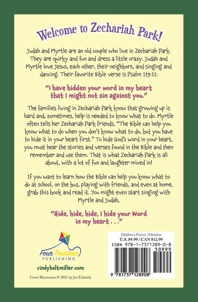 Judah and Myrtle are an old couple who live in Zechariah Park. They are quirky and fun and dress a little crazy. Judah and Myrtle love Jesus, each other, their neighbors, and singing and dancing. Their favorite Bible verse is Psalm 119:11: "I have hidden your word in my heart that I might not sin against you." The families living in Zechariah Park know that growing up is hard and, sometimes, help is needed to know what to do. Myrtle often tells her Zechariah Park friends, "The Bible can help you know what to do when you don't know what to do, but you have to hide it in your heart first." To hide God's word in your heart, you must hear the stories and verses found in the Bible and then remember and use them. That is what Zechariah Park is all about, with a lot of fun and laughter mixed in! If you want to learn how the Bible can help you know what to do at school, on the bus, playing with friends, and even at home, grab this book and read it. You might even start singing with Myrtle and Judah, "Hide, hide, hide, I hide your Word in my heart . . ."