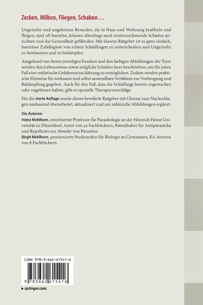 Ausgehend von ihrem jeweiligen Fundort und den farbigen Abbildungen der Tiere, werden ihre Lebensweise sowie mögliche Schäden kurz beschrieben, um für jeden Fall eine realistische Gefahreneinschätzung zu ermöglichen. Zudem werden praktische Hinweise für wirksame und selbst anwendbare Verfahren zur Vorbeugung und Bekämpfung gegeben. Auch für den Fall, dass die Schädlinge bereits zugestochen oder zugebissen haben, gibt es spezielle Therapievorschläge.