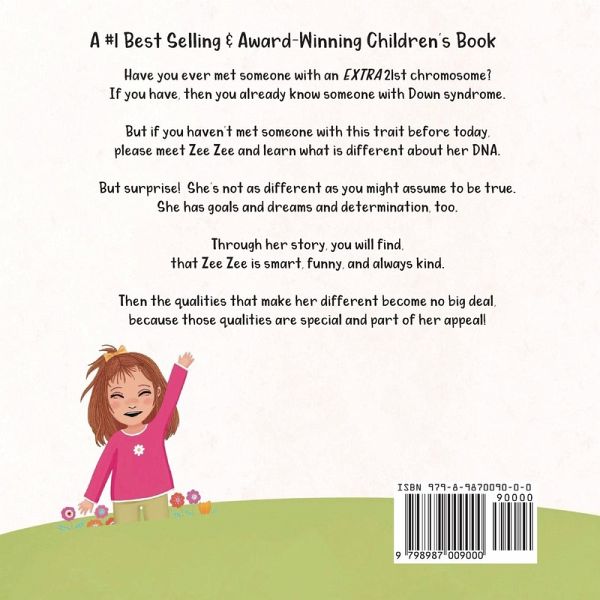Have you ever met someone with an EXTRA 21st chromosome? If you have, then you already know someone with Down syndrome. But if you haven't met someone with this trait before today, please meet Zee Zee and learn what is different about her DNA. But surprise! She's not as different as you might think. Zee Zee is a fun-loving and determined girl who can bake, dance, swim and even fly! Often it is assumed that people with Down syndrome can't do what other kids do, but Zee Zee proves that with a little help and perseverance, she can do anything she sets her mind to. This inclusive #1 best selling children's book is full of positivity and inspiration as Zee Zee shares her empowering story. It is a perfect introduction to Down syndrome for those who are unfamiliar or just want to learn more. Readers' Favorite gave this book a 5-star review! It is a great education tool for typical kids, parents, parents with new babies who have Down syndrome, teachers, librarians, therapists, and doctors alike to help inform everyone that Down syndrome is not a condition to be feared but embraced, and even celebrated. Zee Zee Does It Anyway is a fantastic introductory book on Down syndrome for children. It perfectly illustrates the wonderful quote by Carl Jung, "I am not what happened to me. I am what I choose to become." I love the positivity and can-do attitude that permeates this lovely book. Thanks, Zee Zee! - Brian Donovan, Advocate, Sibling, and Director of Kelly's Hollywood