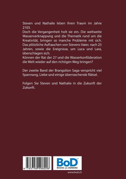 Steven und Nathalie leben Ihren Traum im Jahre 2103.Doch die Vergangenheit holt sie ein. Die weltweite Wasserverknappung und die Thematik rund um die Kreativität, bringen so manche Probleme mit sich. Das plötzliche Auftauchen von Stevens Vater, nach 25 Jahren, sowie die Ereignisse, um Luca und Lara, überschlagen sich.Können der Rat der 27 und die Wasserkonföderation die Welt wieder auf den richtigen Weg bringen?Der zweite Band der Brangolion Saga verspricht viel Spannung, Liebe und einige überraschende Rätsel.Folgen Sie Steven und Nathalie in die Zukunft der Zukunft.