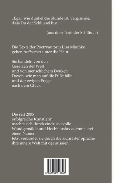 Treffsicher unter die Haut gehen die Texteder Poetryautorin Lisa Mischke.Sie handeln von den Gesetzen der Weltund von menschlichem Denken.Davon, wie man auf die Füße fälltund der ewigen Fragenach dem Glück.Die seit 2005erfolgreiche Künstlerinmachte sich durch eindrucksvolle Wandgemälde und Hochhausfassadenmalereieinen Namen.Jetzt verbindet sie durch die Kunst der Sprache ihre innere Welt mit der äussren.