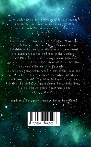 "Der Gedanke an den Selbstmord ist ein starkes Trostmittel: mit ihm kommt man gut über manche böse Nacht hinweg." - Friedrich NietzscheFiona hat nur noch einen einzigen Wunsch: Sie möchte endlich sterben. Traumatische Erlebnisse haben ihre Welt erschüttert und sie kann an nichts anderes mehr denken. Ihren Plan hat sie allerdings ohne Johanna gemacht, ihre Lehrerin. Diese nähert sich ihr an, und scheint ihre Fassade zu durchbrechen. Fiona weiß nicht mehr, was sie will. Leben oder Sterben? Nachdem sie dann auch noch in der Psychiatrie landet, erobert Milea ihr Herz. Ausgerechnet dort. Schaffen die Beiden es gemeinsam aus dem Teufelskreis?explizite Triggerwarnung! Bitte beachten!