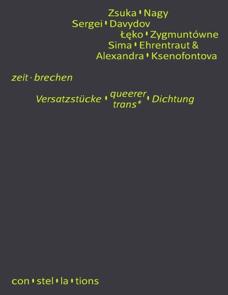 Der Band konstelliert Gedicht-Übersetzungen, Roman-Auszug, Gespräch und künstlerische Essays der Dichterin Zsuka Nagy, d* Lyriker*in und Chemiker*in ¿¿ko Zygmuntówne und des Schriftstellers und Dramaturgen Sergej Davydov um die Frage, wie unterschiedliche Zeitlichkeiten das Material und die Sprache der Literaturen formen. In den Arbeiten der drei Autor*innen werden je eigene - trans*, queere oder genderambige - Zeiterfahrungen artikuliert und in ihrer Verstrickung in historische und gesellschaftliche Zeitordnungen sichtbar gemacht. Die Texte erschreiben gegenläufige Geschichts-, Gegenwarts- und Zukunftsentwürfe, die sich ihren teils oppressiven Kontexten widersetzen. Übersetzungen ins Deutsche von Ruth Altenhofer, Maria Buzhor, Agnieszka Koz¿owska, Pawel Matusz, Eva Zador ** con·stel·la·tions publiziert kollaborative Wissenszusammenhänge, die an der Schnittstelle von künstlerischer und akademischer Praxis entstanden sind. Die Formate bewegen sich an den Grenzen oder jenseits klassischer geisteswissenschaftlicher Publikationsformen. con·stel·la·tions ist die Publikationsreihe der gleichnamigen Plattform für kollaborative, vernetzte und transdisziplinäre Formate des Exzellenzclusters 2020 Temporal Communities: Doing Literature in a Global Perspective an der Freien Universität Berlin. Im engen Dialog mit außeruniversitären Forschungseinrichtungen und Kulturinstitutionen - Museen, Theatern, Archiven, Bibliotheken - verbindet der Bereich Perspektiven und Methoden aus Kunst und Wissenschaft.