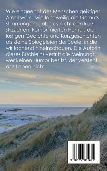 Wie eingeengt des Menschen geistiges Areal wäre, wie langweilig die Gemütsstimmungen, gäbe es nicht den kurzskizzierten, kompri-mierten Humor, die lustigen Gedichte und Kurzgeschichten als kleine Spiegeleien der Seele, in die wir lachend hineinschauen. Die Autorin dieses Büchleins vertritt die Meinung: wer keinen Humor besitzt, der versteht das Leben nicht.